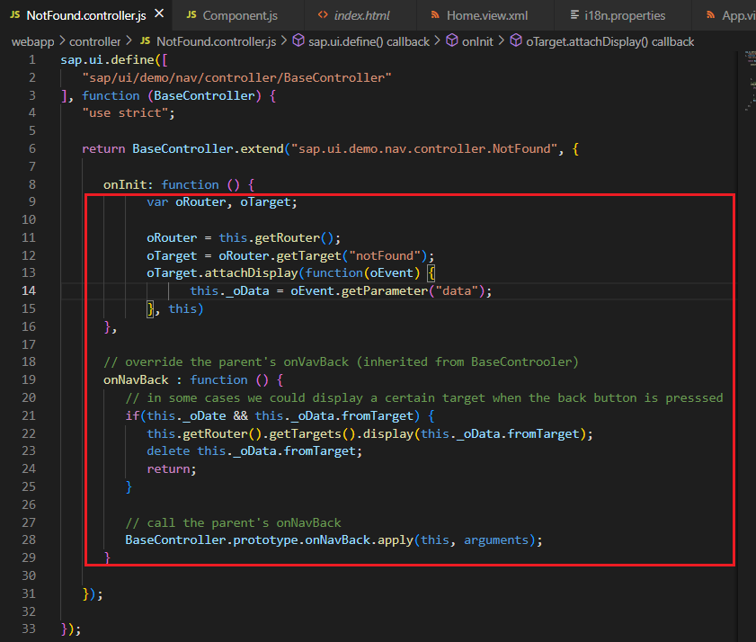 1) 'onInit' 핸들러에 변수 'orouter', 'oTarget' 지정