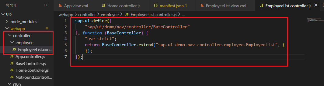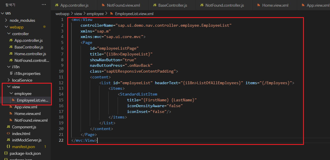 1) 'sap.ui.demo.nav.view.employee.EmployeeList' view를 통해 직원 리스트 불러오기
