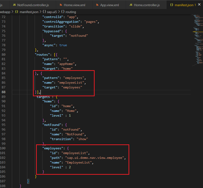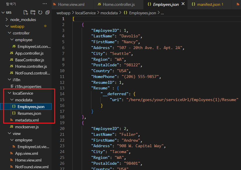 ○ 직원 리스트에서 각 직원의 상세 정보 보여주기 - [manifest.json] 1) 직원 정보가 저장돼 있는 데이터 모델에서 각 직원의 entity가 EmployeeID로 식별돼 있음 2) 새로운 'pattern'으로 'employees'에 이어 '{em