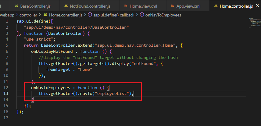 - 'onNavToEmployees' 핸들러에 'employeeList'를 매개로 'getRouter()'의 'navTo()' 메서드 호출해 경로 지정