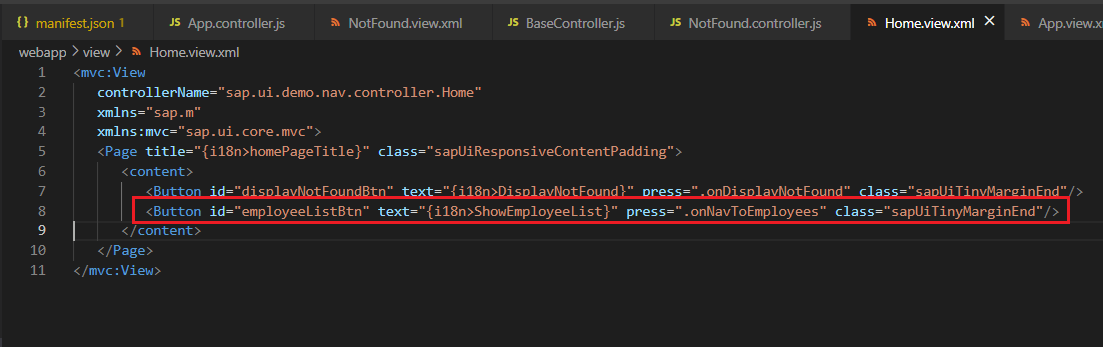 - [Home.view.xml]에서 'id'를 'employeeListBtn'로 하고 'class'를 'sapUiTinyMarginEnd'로 지정하는 버튼 입력