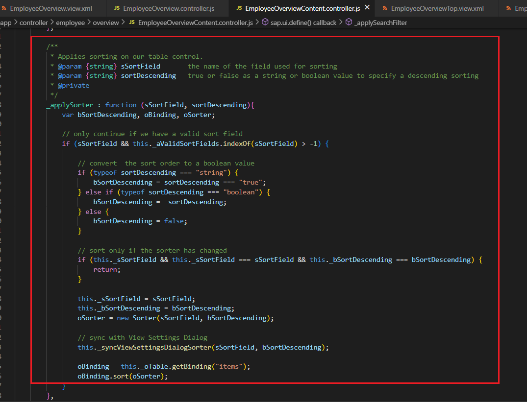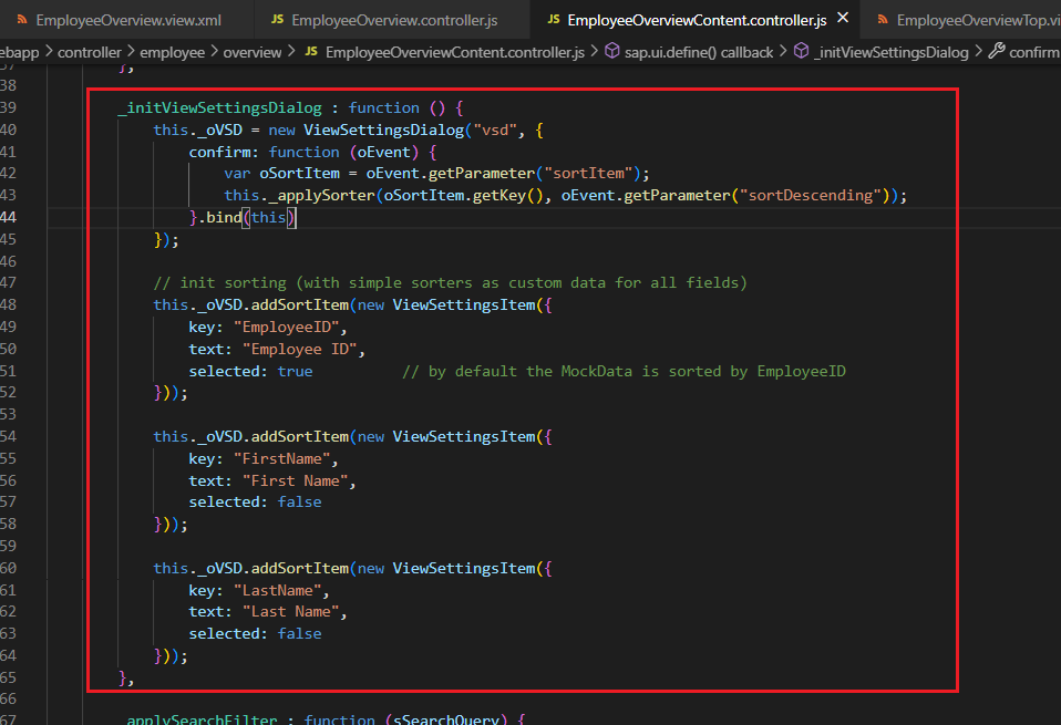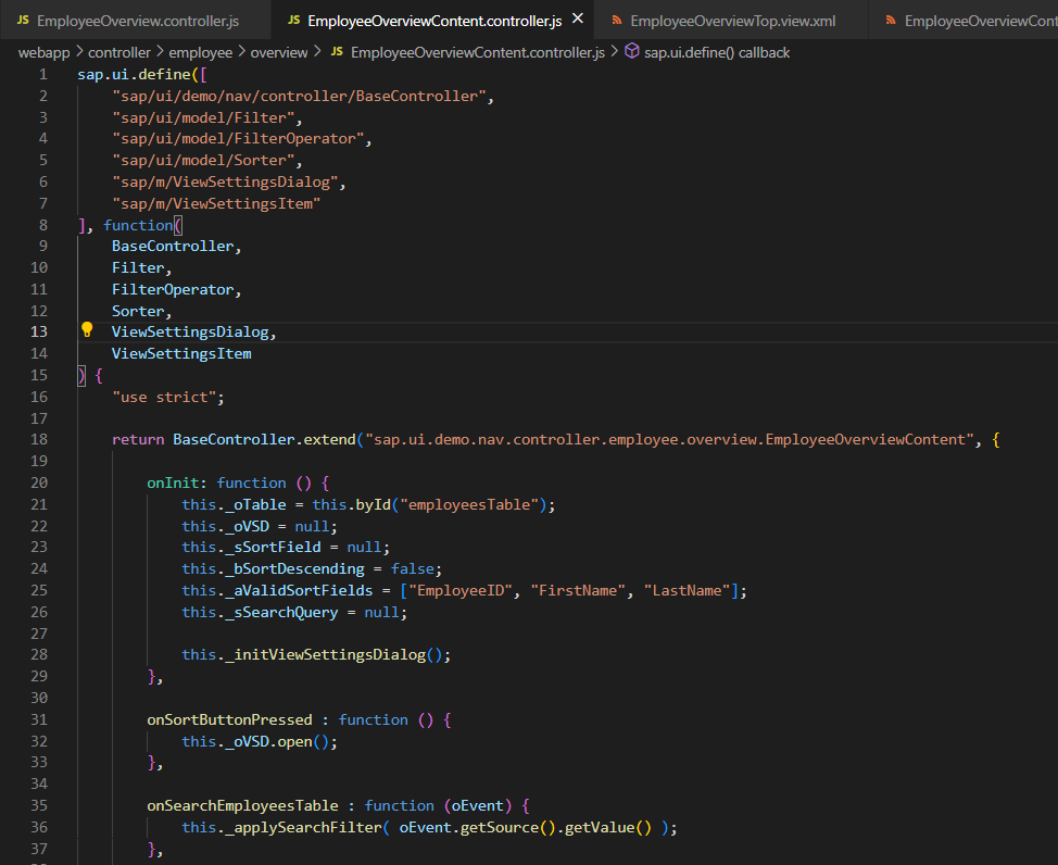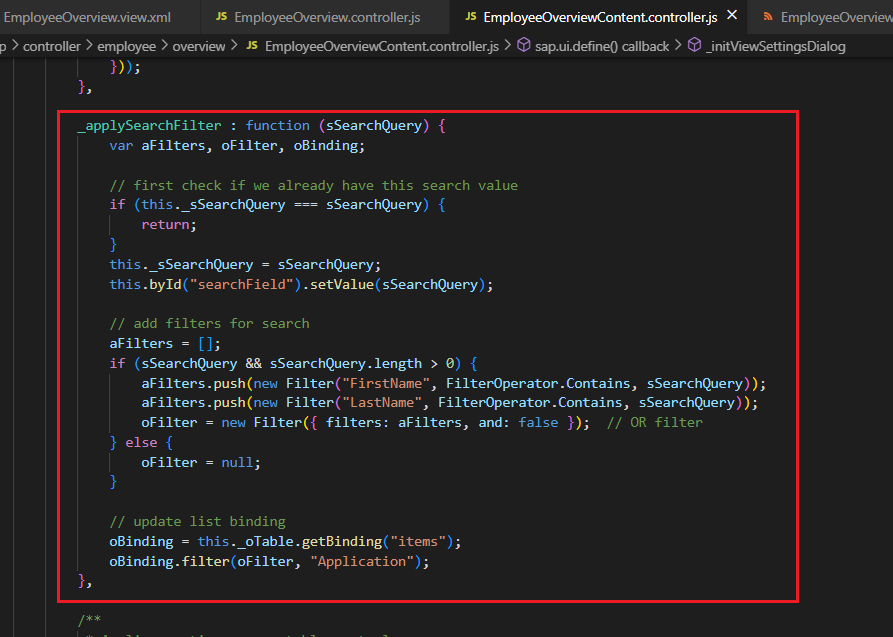 2) [EmployeeOverviewContent.view.xml]에서 'Searchfield'를 구현하기 위해 'Filter', 'FilterOperator', 'Sorter' 사용