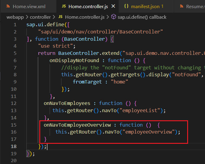 1) [Home.view.xml]의 'press'와 연결할 'onNavToEmployeeOverview' 핸들러 구성