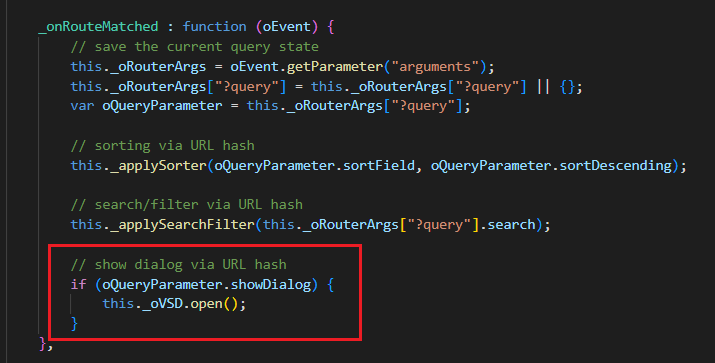 2) '?query' 값이 내장돼 있는 '_oRouterArgs' 배열함수에 'showDialog' 매개변수를 호출