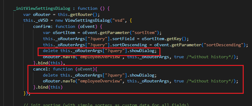 * 'navTo() 호출하기 전에 'this._oRouterArgs["?query"].showDialog' 삭제