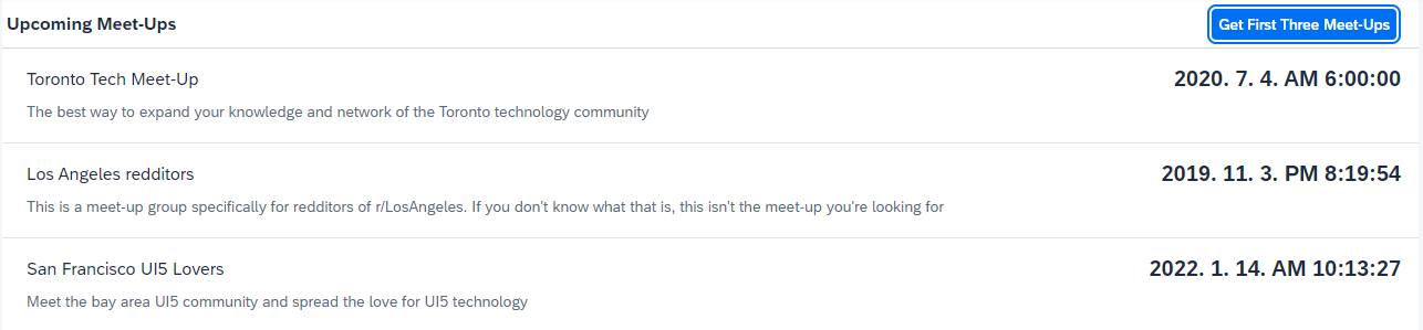 - [ Get First Three Meet-Ups ] 버튼을 누르면 모든 데이터 정보를 보여주는 것이 아니라, 3개까지만 보여준다!