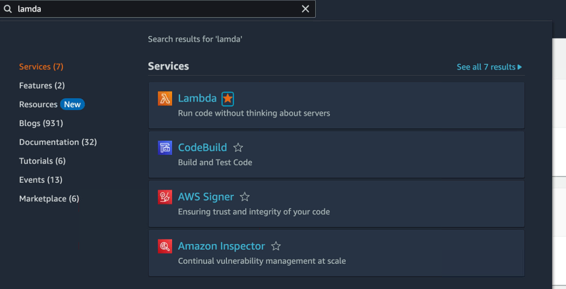 AWS 계정에 로그인을 한 후에 사이트 상단에 있는 검색창에 Lambda를 검색하고 클릭해 해당 페이지로 접속한다.