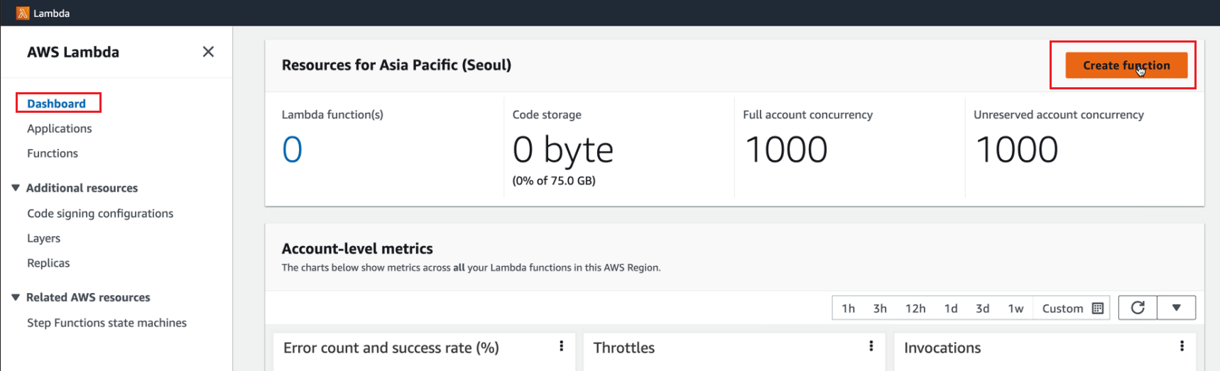 Lambda 페이지에서 위 페이지는 Dashboard를 클릭해 확인할 수 있다.
