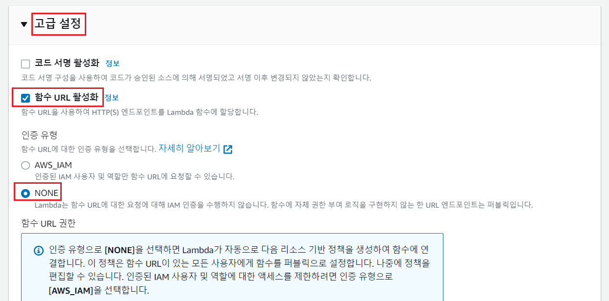 뿐만 아니라 Advanced Setting, 즉 고급 설정을 열어서 함수 URL 활성화를선택해주고,