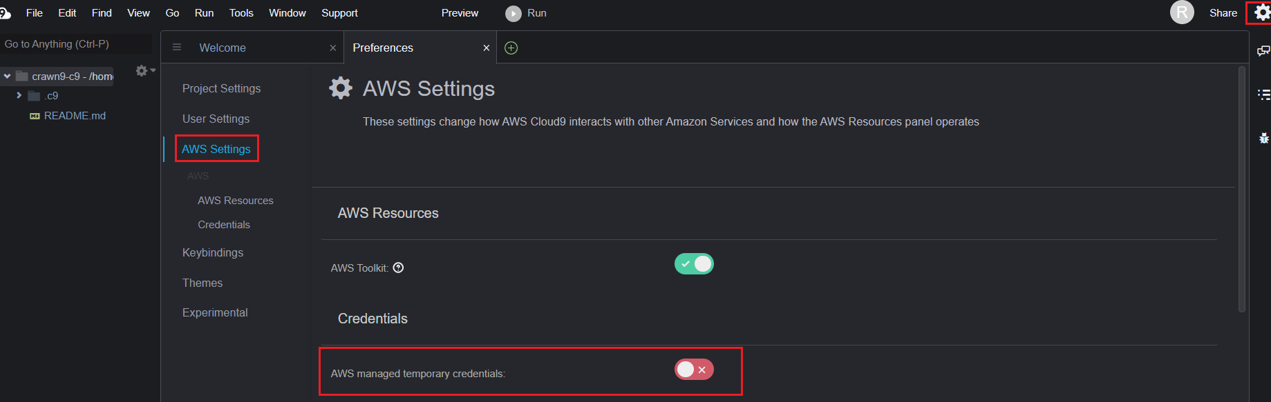 Cloud9 진입에 성공하였다면, 페이지 우측 상단의 톱니바퀴를 클릭하고