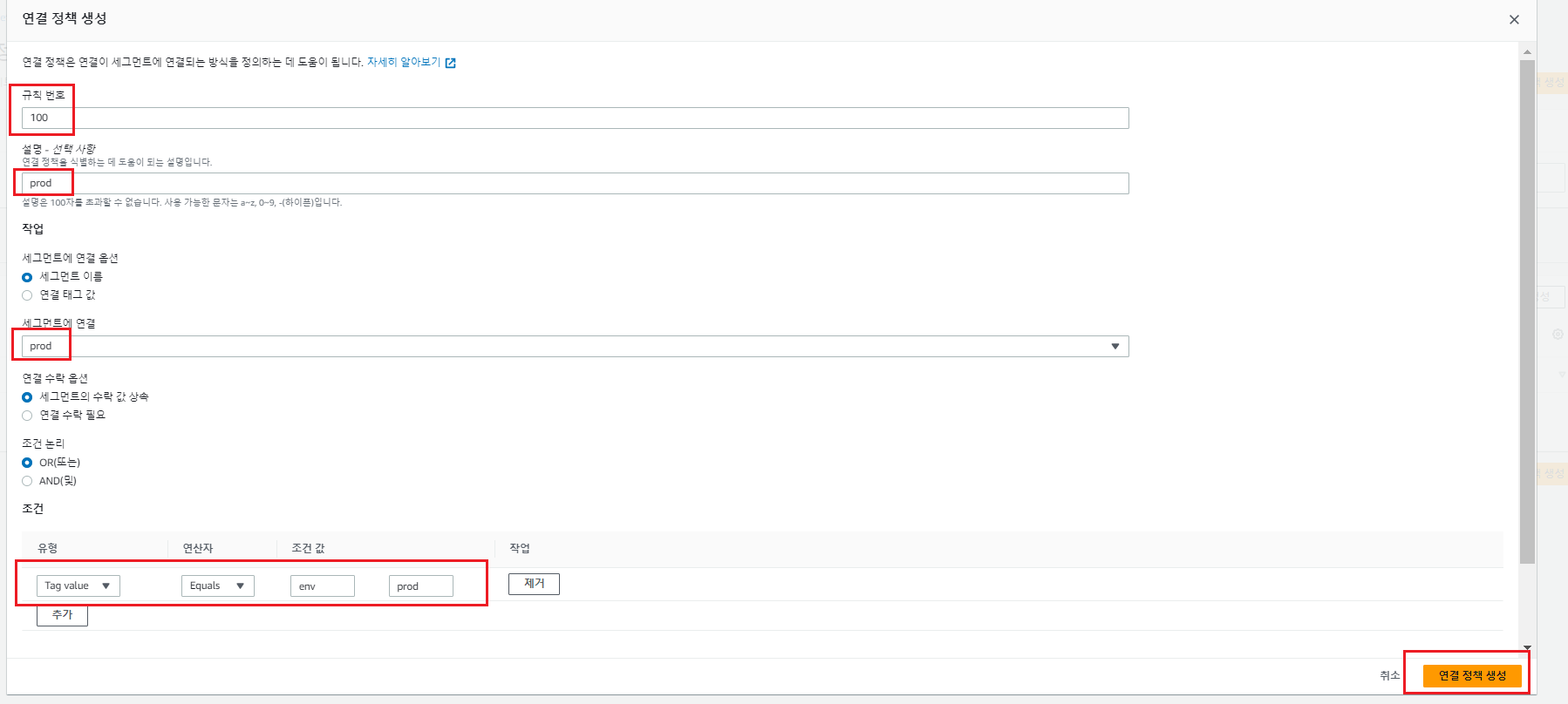 그리고 Conditions에 Type은 Tag Value, Operator는 Equals, Conditons values는 env와 prod로 설정한다.