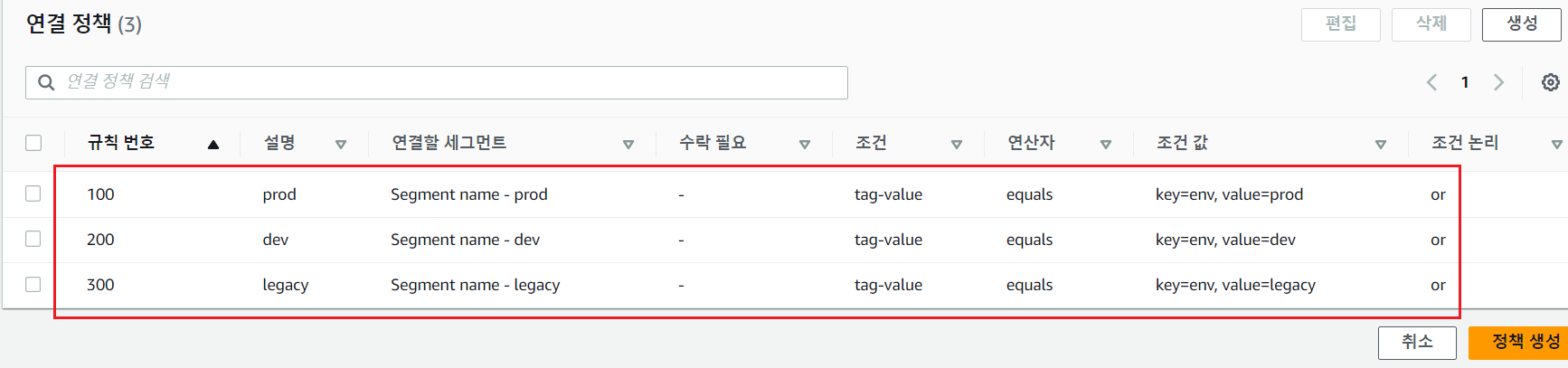 이제 위와 같이 dev, legacy의 설정도 진행해 준 뒤 우측 하단의 (Create Policy)정책 생성을 클릭한다.