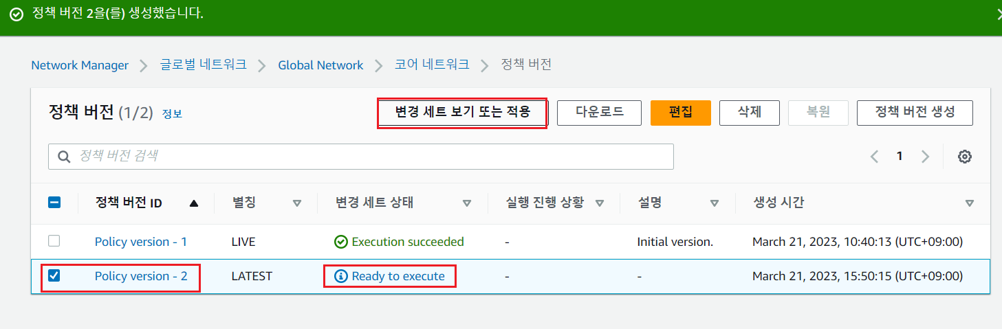 Ready to execute 상태에 있는 정책을 선택하고 변경 세트 보기 또는 적용을 클릭해 변경점을 확안히고