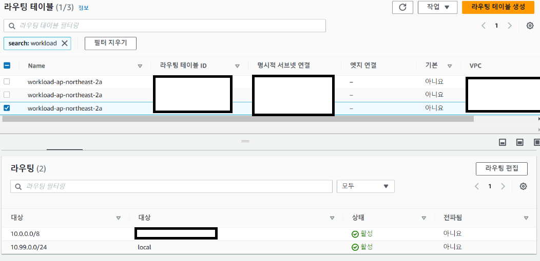 | Legacy | 10.99.0.0/24 | seoul | 10.0.0.0/8 -> Transit Gateway | workload |