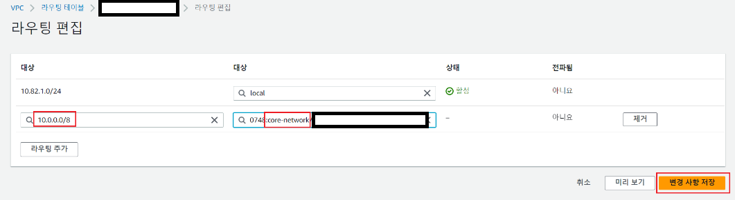 Target을 dev, prod VPC에 속한 Routing Table들은 Core network로 선택하지만