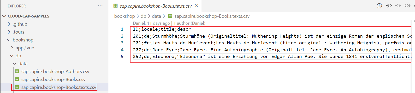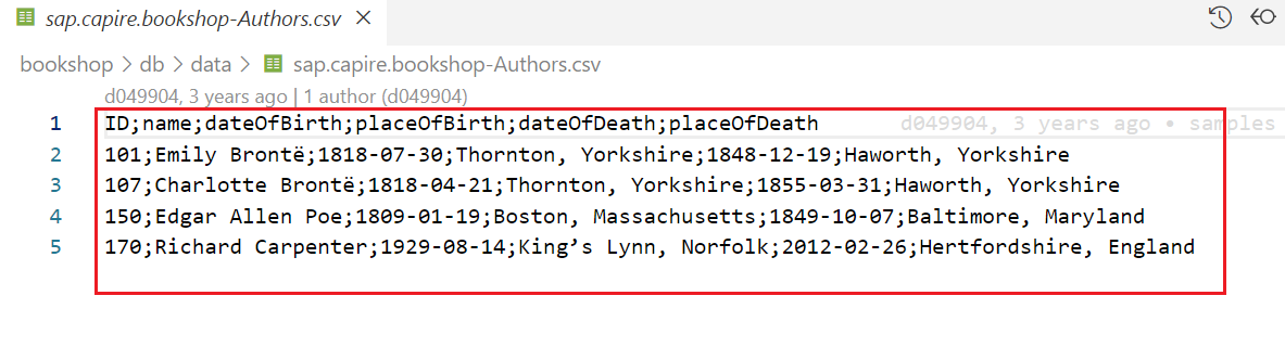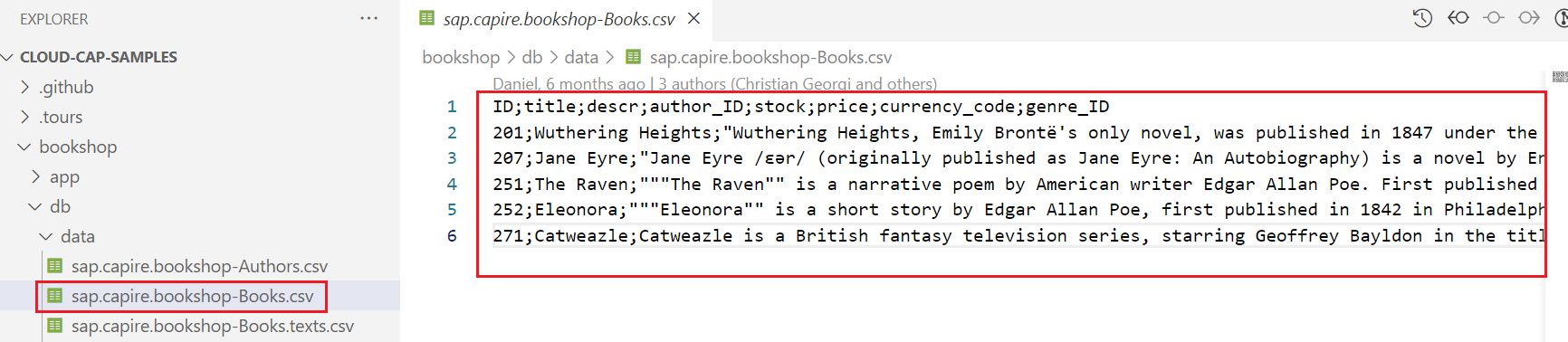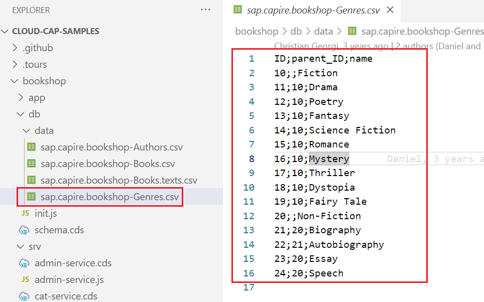 이전과 같이 sap.capire.bookshop-Genres.csv 파일을 생성한다.