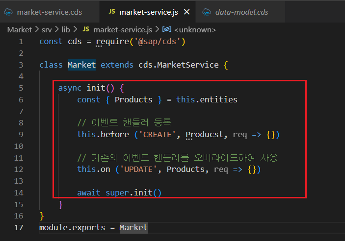 Service를 실행하기 위해서는 생성해두었던 .cds 파일과 동일한이름의 .js 파이을 배치하면 된다.