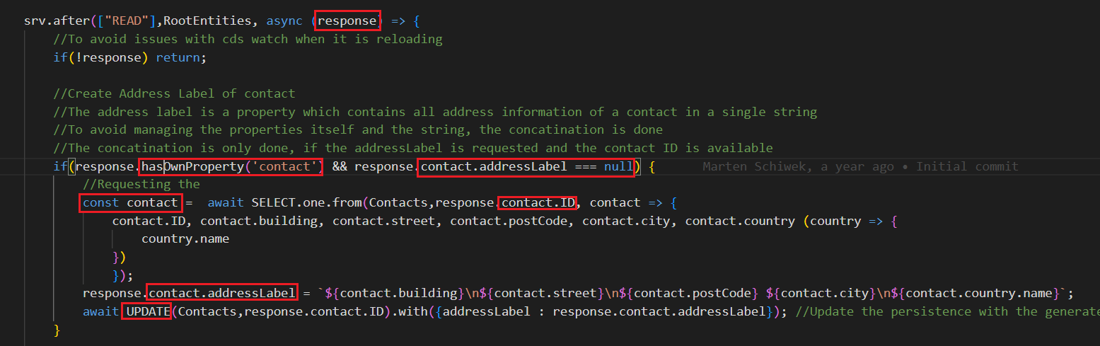변수 contact에는 service.cds에서 사용키로 하였던 entity Contacts에서 contact의 ID를 킷값으로 둔다(?)