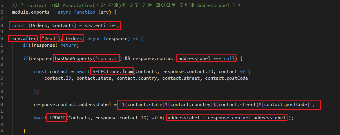 Contacts 테이블에서 ID를 킷값으로 하여 기존의 값 또는 새롭게 생성된 addressLabel로 갱신시켜준다.