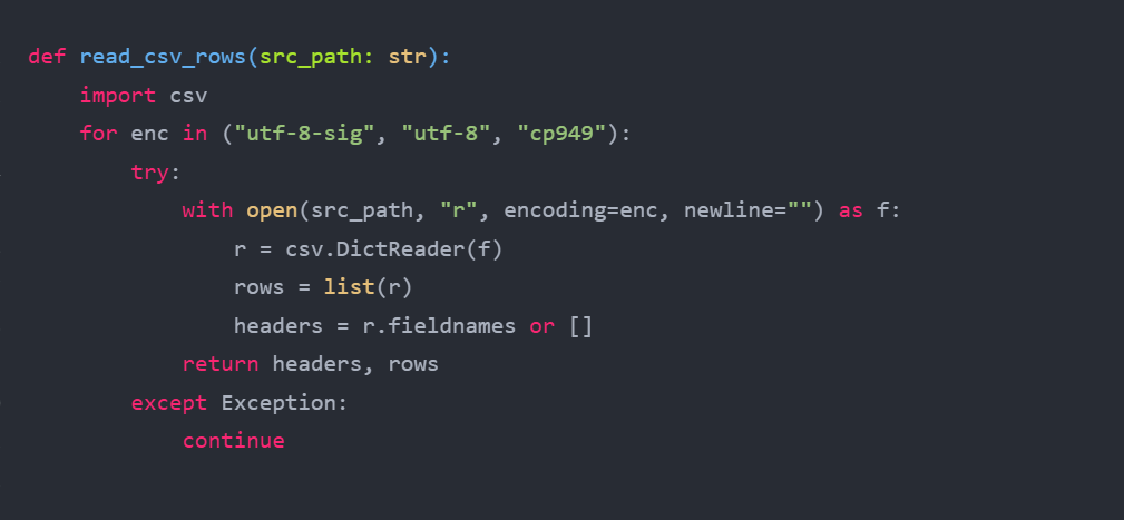 - headers = r.fieldnames or [] : DictReader가 잡아둔 header 배열을 꺼내 header가 없으면 빈 리스트로 인식