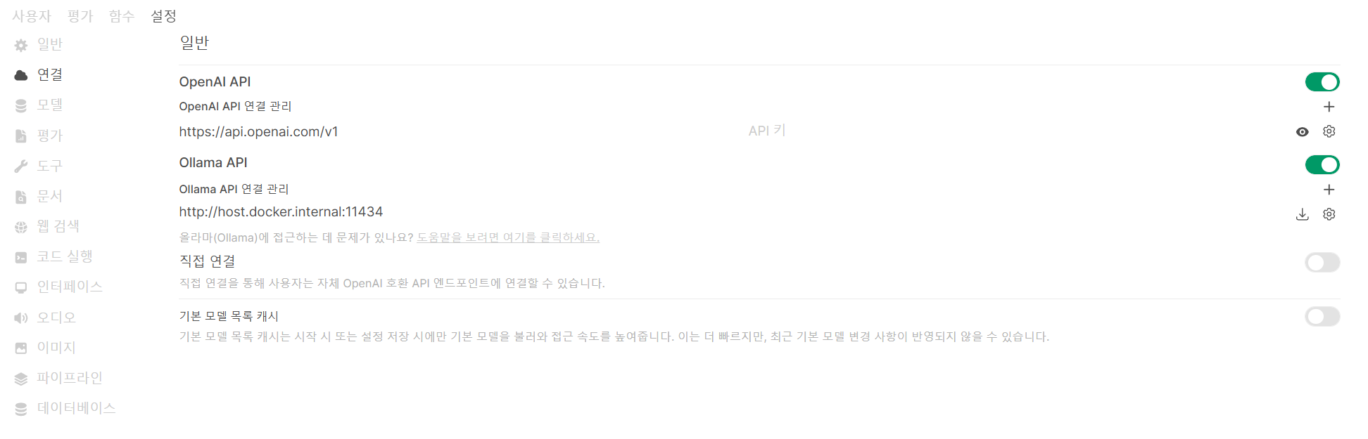 - Open WebUI에서 우측 상단의 계정 > 관리자패널 > 설정 > 연결 로 가면 Ollama API 연결 설정을 할 수 있다.