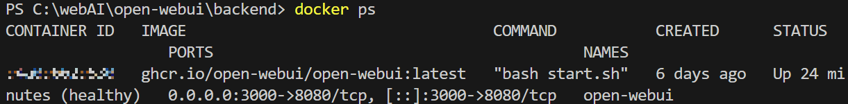- docker ps 명령어로 open-webui 컨테이너가 실행되는 지 확인