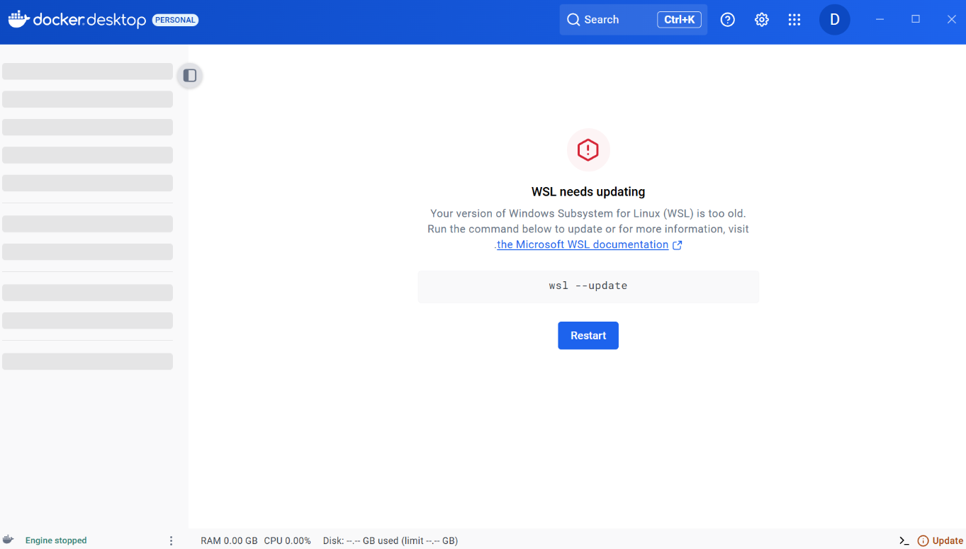 - 만약 아래와 같이 "WSL needs updating"이라고 경고문이 나오면 제안해주고 있는 명령어로 업데이트 및 재부팅해야 한다.