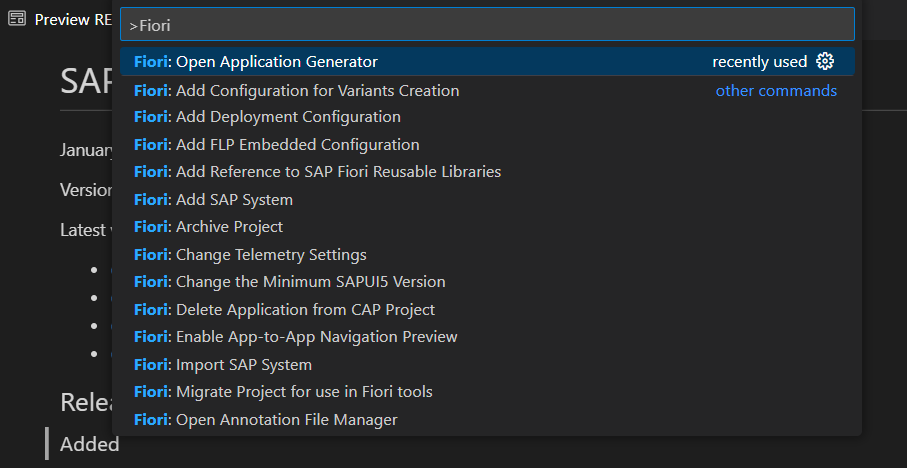 - F1 눌러 Fiori: Open Application Generator 클릭