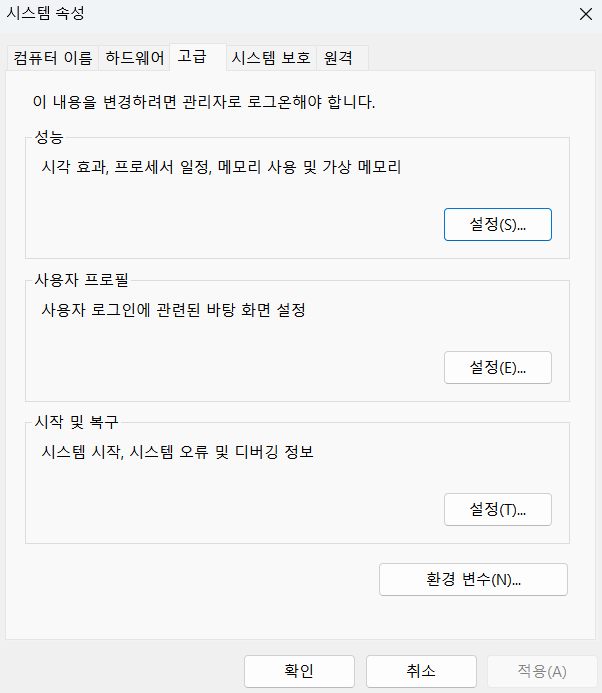 - 설치 완료 후, 시스템 환경변수 설정 진행