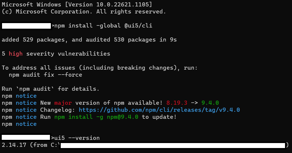 - 설치 완료 후, ui5 -version 입력 및 확인