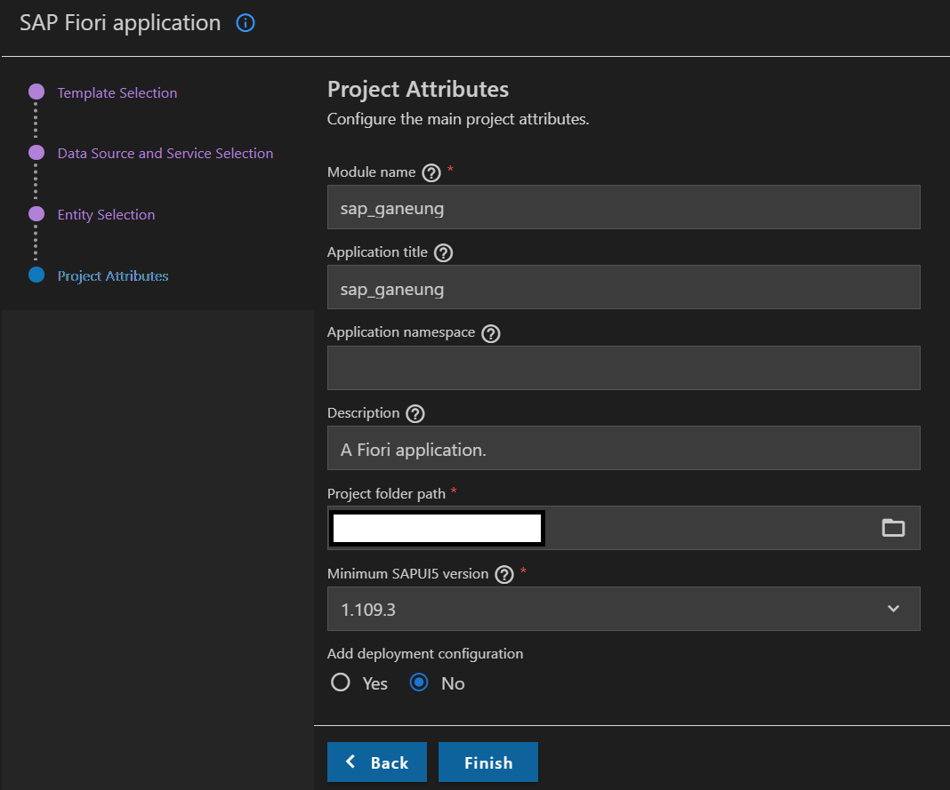 - 필수항목 입력 후, Add deployment configuration에서 'No' 선택 및 Finish 클릭