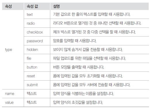 | <form 속성1 = "값1" [속성2 = "값2"] ...> // 다양한 입력 양식 태그(<input>, <select>, <textarea>) </form> |