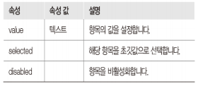 | <select 속성1 = "값1" [속성2="값2" ...]> <option 속성1="값" [속성1]> 항목1</option> <option 속성2="값" [속성2]> 항목2</option> ...(생략)... </select> |