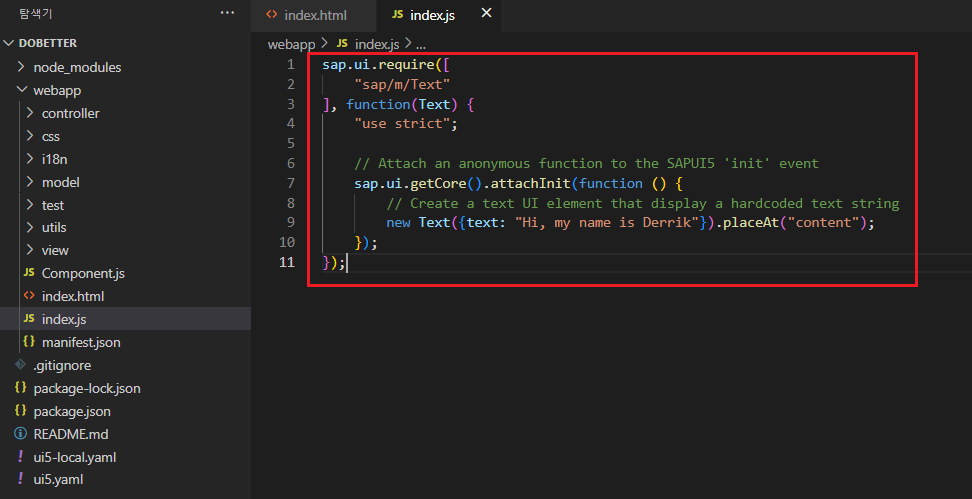 - index.js 생성 및 코드 Text 컨트롤 입력
