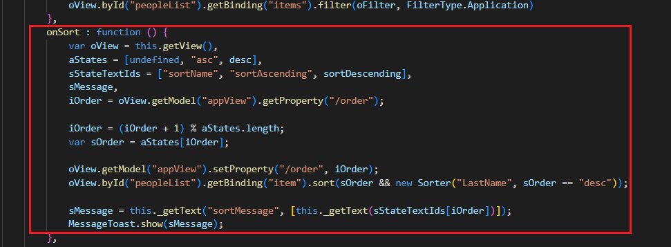 - sap.ui.model.Sorter : list 바인딩 정렬 방법을 호출해 테이블에 적용