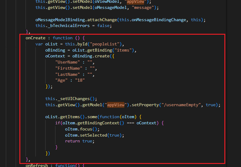 2) ODataListBinding API의 create 메서드 사용해 'oBinding'한 'oContext'를 반환