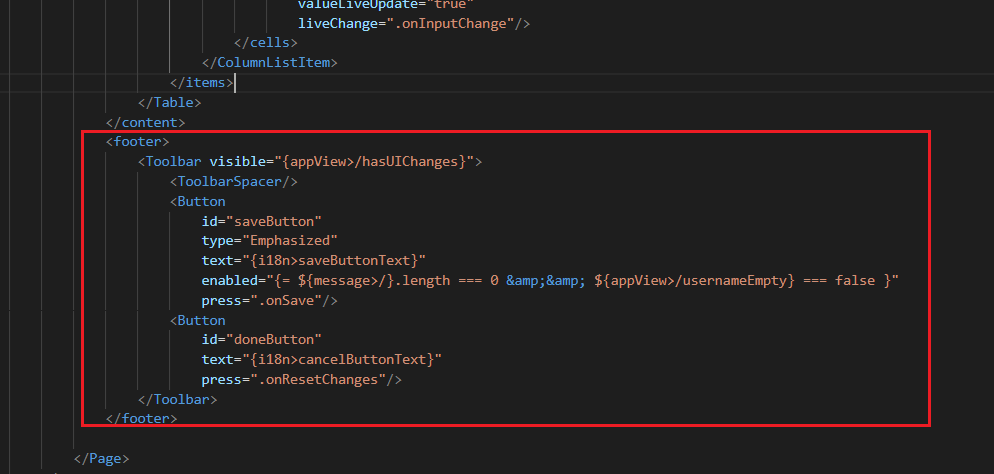 - appView 모델을 통해 표시하거나 숨길 수 있는 저장 및 취소 버튼 포함된 바닥글 모음 도구로 정의한다.