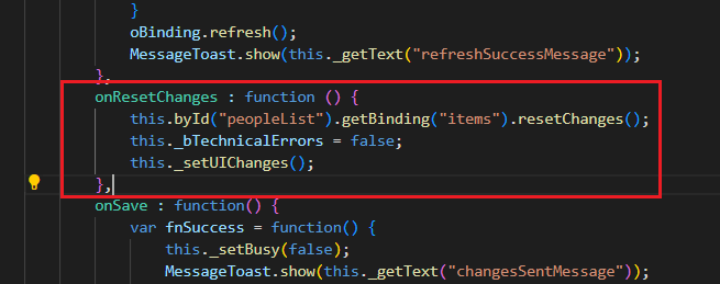 1) App.view.xml 'table'의 id 'peopleList'를 불러 'resetChanges()' 메서드를 이용해 보류 중인 변경 사항 삭제 처리한다.