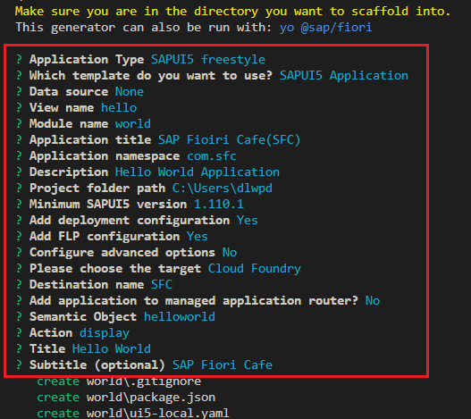 - [terminal]에 'yo' 입력 및 [@sap/fiori] 선택