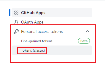 - [Personal access tokens]에서 [Tokens(classic)] 선택 및 토큰 생성